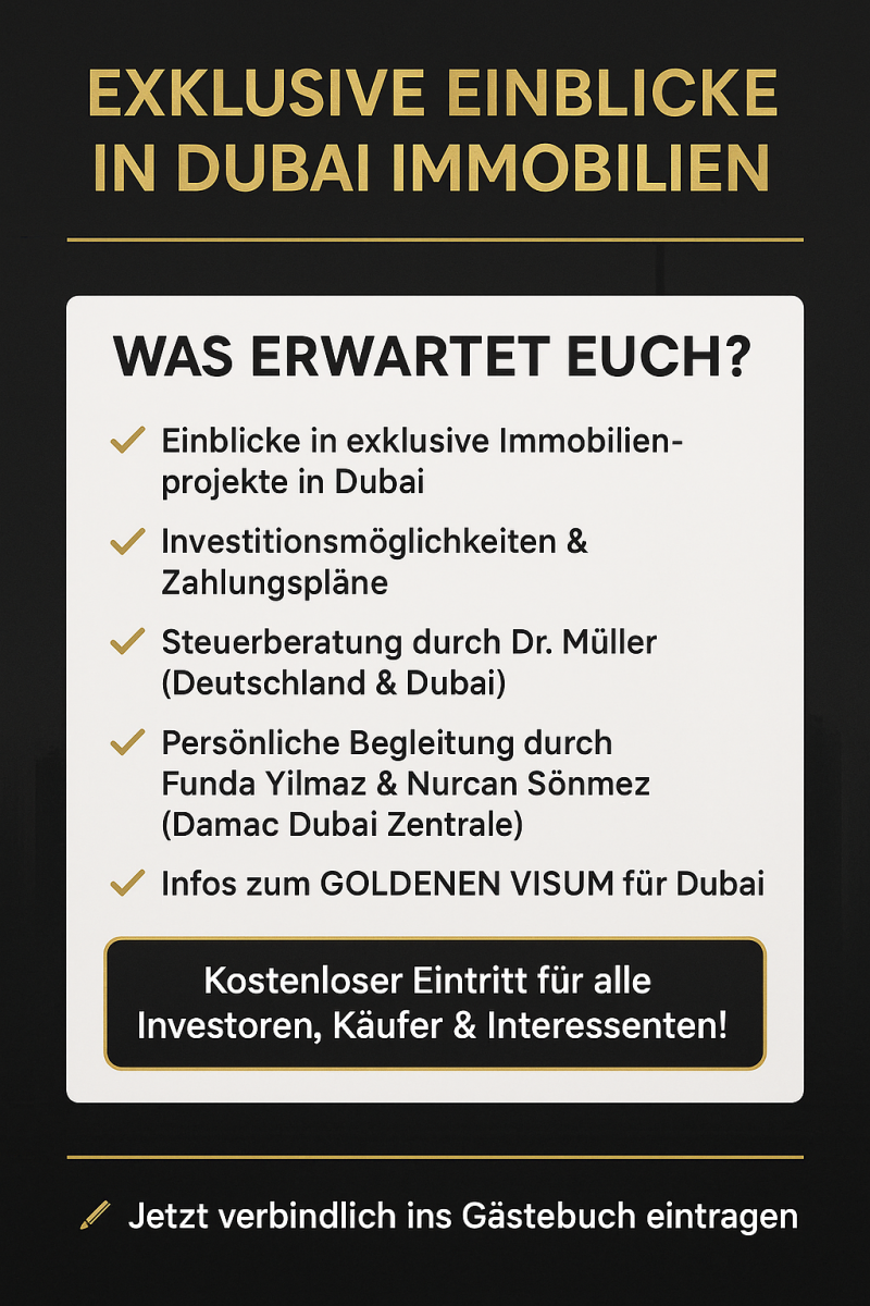Erleben Sie ein außergewöhnliches Event in Berlin, das von Goldberg exklusiv für Immobilienliebhaber und Investoren präsentiert wird. Gemeinsam mit Damac Properties, einem weltweit anerkannten Entwickler luxuriöser Immobilien, laden wir Sie ein, in die Welt erstklassiger Wohn- und Gewerbeimmobilien einzutauchen. Entdecken Sie die neuesten Angebote und erfahren Sie mehr über einzigartige Investitionsmöglichkeiten, die Ihnen nur hier geboten werden. Dieses Event ist der perfekte Ort, um wertvolle Einblicke zu gewinnen, sich mit Experten auszutauschen und Ihre Zukunft im Immobiliensektor zu gestalten. Seien Sie dabei und lassen Sie sich inspirieren – ein Erlebnis, das Sie nicht verpassen sollten!